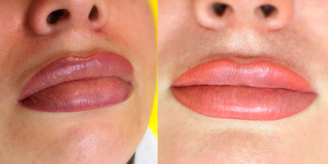 В отличие от акварельной техники, классический контурный татуаж не подразумевает пигментацию всей площади губ – их при желании можно подкрашивать помадой или косметическим блеском. С одной стороны, такая особенность сводит объем вмешательства к минимуму, значительно сокращая реабилитационный период, с другой – требует тщательного подбора пигмента, ведь при малейшем отклонении яркий контур будет смотреться неестественно и вульгарно. Впрочем, с последним нюансом легко справиться при использовании современных разновидностей контурного татуажа и сочетания техники с другими, более нейтральными методиками введения красящего состава.