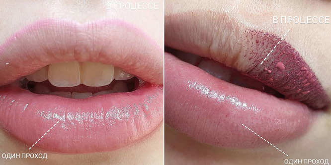 После этого губки обрабатываются обезболивающим гелем или спреем, который снижает чувствительность, делая процедуру абсолютно безболезненной. Когда область рта станет менее восприимчивой, мастер вводит выбранные пигменты, аккуратно растушевывая каждый штрих для создания равномерного и естественного оттенка. А в завершении сеанса губы обрабатываются специальным противовоспалительным составом для более быстрого и безболезненного восстановления.